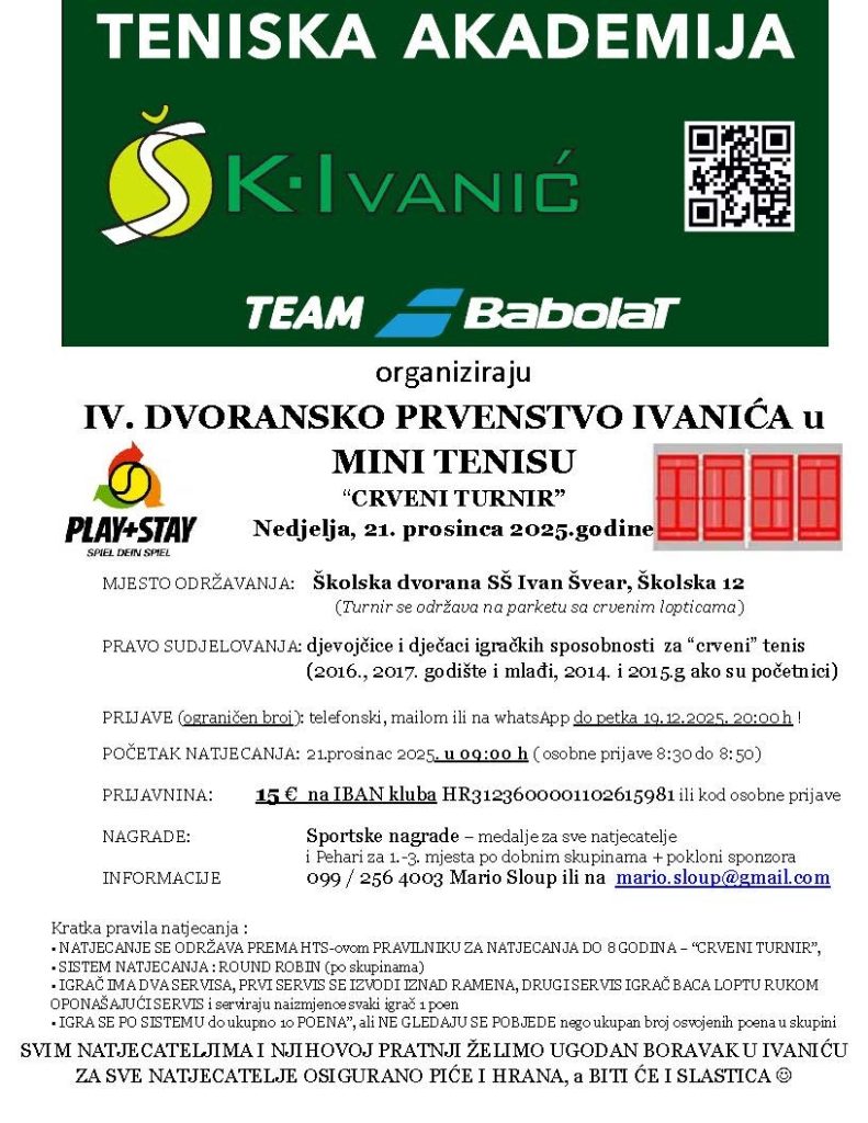 Teniska akademija ŠK Ivanić, u suradnji s Team Babolat, organizira IV. Dvoransko prvenstvo Ivanića u mini tenisu – „Crveni turnir“, koje će se održati u nedjelju, 21. prosinca 2025. godine, u školskoj dvorani SŠ Ivan Švear u Ivanić-Gradu.