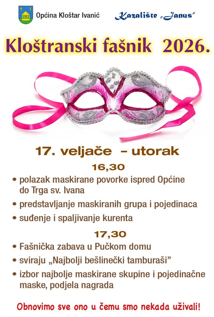 Općina Kloštar Ivanić i Kazalište “Janus” pozivaju sve mještane i posjetitelje na tradicionalni Kloštranski fašnik 2026., koji će se održati 17. veljače (utorak).