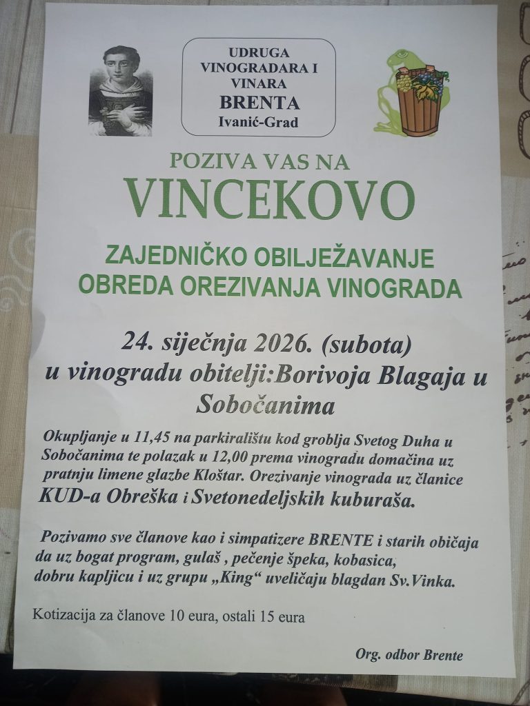 Udruga vinogradara i vinara Brenta Ivanić-Grad poziva na Vincekovo – zajedničko obilježavanje tradicionalnog obreda orezivanja vinograda.